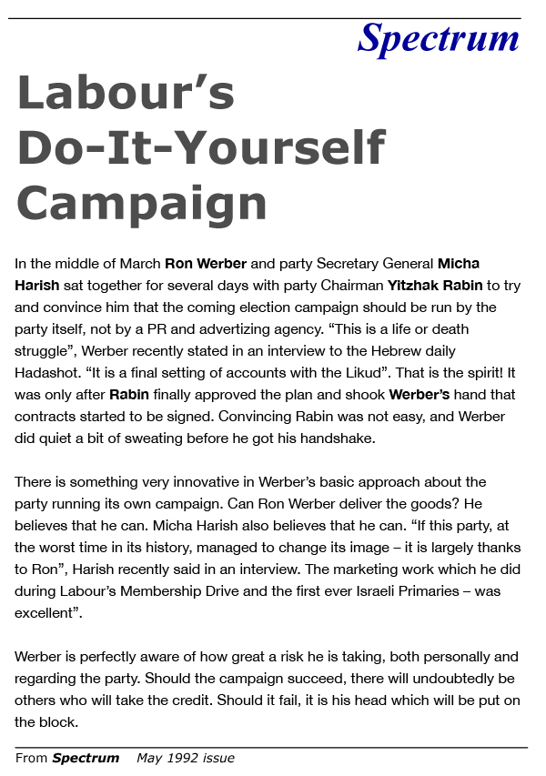 לאחר המפלה של מפלגת העבודה בבחירות המוניציפאליות ובבחירות הכלליות של שנת 1988, גויס רון ורבר לנהל את מערך ההסברה של המפלגה, ע"י מי שנבחר לאחר הבחירות לתפקיד מזכ"ל העבודה, מיכה חריש. בין השנים 1992-1989 היה ורבר שותף לצוות המצומצם בהנהגת חריש ובניהולו השוטף של יובל פרנקל זכרו לברכה, ששיקם את תשתית הסניפים של מפלגת העבודה, הוביל את קמפיין מפקד החברים הגדול אי פעם ("מצטרפים וקובעים", 1991-1990) את שיווק וניהול הפריימריס הראשונים בישראל (1992-1991), ואת חידוש תשתיות השטח וההסברה של העבודה באותם ימים - בואך קמפיין הניצחון בבחירות הכלליות של שנת 1992 ובחירתו של יצחק רבין ז"ל לתפקיד ראש ממשלת ישראל. בשנת 1994, ניהל ורבר יחד עם שותפו באותם ימים, יריב בן-אליעזר, את קמפיין הנצחון של חיים רמון לראשות הנהגת ההסתדרות.